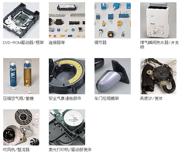 在連接器、微型開關、電容器外殼等的電子零件,OA機器的鍵盤以及電話機的功能部件、車載電子零件以及車門把手等汽車零部件上都有其應用;其次在建筑材料、精密儀器等貼近我們的日常生活的許多用品上都采用了這種樹脂。