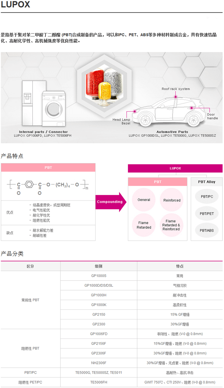 韓國LG公司LUPOX系列PBT聚對苯二甲酸丁二醇酯 你要找的型號就在下面:(請用Ctrl+F鍵查找牌號更快捷)