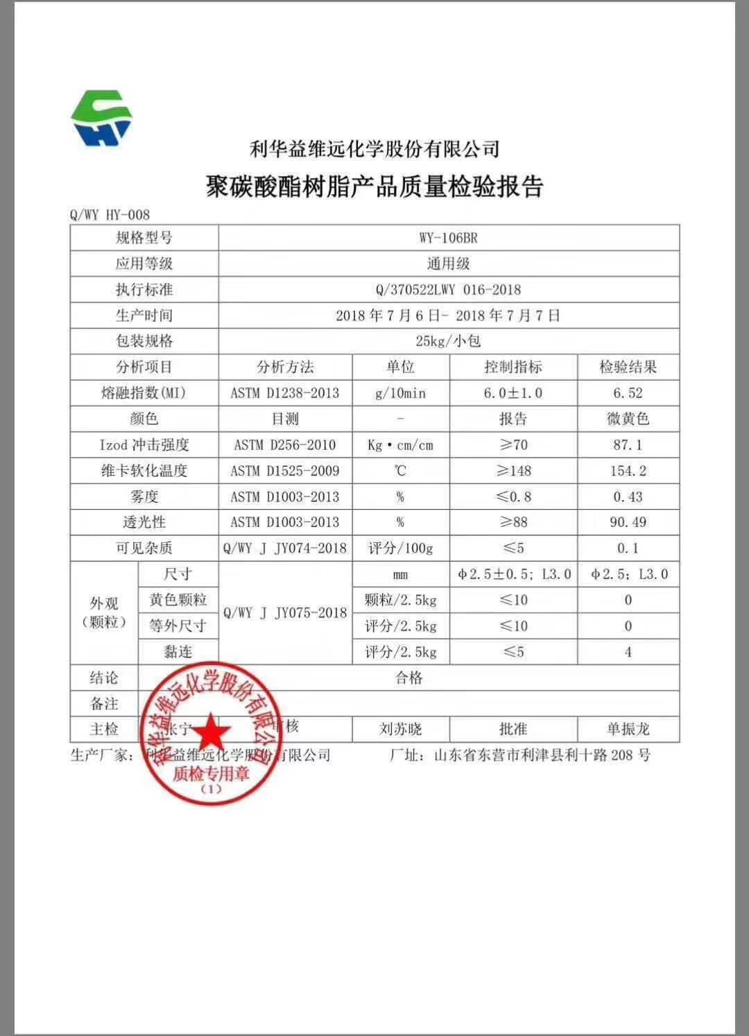 利華益維遠PC WY-106BR樹脂是一種聚碳酸酯無色透明,耐熱,抗沖擊,阻燃BI級,在普通使用溫度內都有良好的機械性能,分子中碳酸基團與另一些基團交替排列,這些基團可以是芳香族,可以是脂肪族,也可兩者皆有。雙酚A型PC是最重要的工業產品,具有優異的抗沖擊性能、耐熱畸變性能和光學透明度,產品包含有4種添加劑產品類型,含脫模劑和抗紫外線穩定劑,PC WY-106BR用途廣泛,主要應用于玻璃裝配業、汽車工業和電子、電器工業,其次還有工業機械零件、光盤、包裝、計算機等辦公室設備、醫療及保健、薄膜、休閑和防護器材等,還可與其它樹脂制成塑料合金,以滿足特定應用領域對成本和性能的要求。