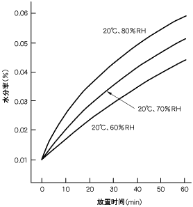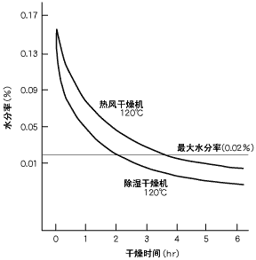 如果干燥后在常溫下放置,粒料就會在短時間內因吸收水分而達到平衡水分率。務請保持溫度,以免吸收水分。