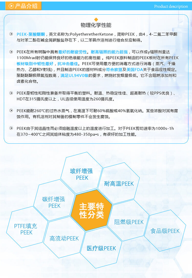 產品名稱:聚醚醚酮(PEEK)樹脂是一種性能優(yōu)異的特種工程塑料,與其他特種工程塑料相比具有更多顯著優(yōu)勢,耐正高溫260度、機械性能優(yōu)異、自潤滑性好、耐化學品腐蝕、阻燃、耐剝離性、耐磨性、不耐強硝酸、濃硫酸、抗輻射、超強的機械性能可用于高端的機械、核工程和航空等科技。
