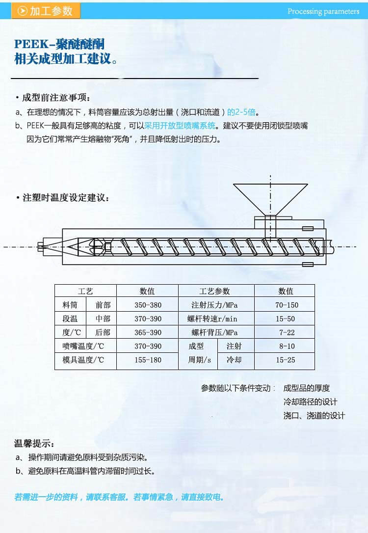 聚醚醚酮在熔點以上有良好的熔融流動性和熱穩(wěn)定性。因而具有熱塑性塑料的典型成型加工性能,因此可用注塑、擠出、吹塑、層壓等成型方法,還可紡絲、制膜。雖然聚醚醚酮熔融加工溫度范圍為360~400℃,但是由于它的熱分解溫度在520 ℃以上,因而它仍具有很寬的加工溫度范圍。