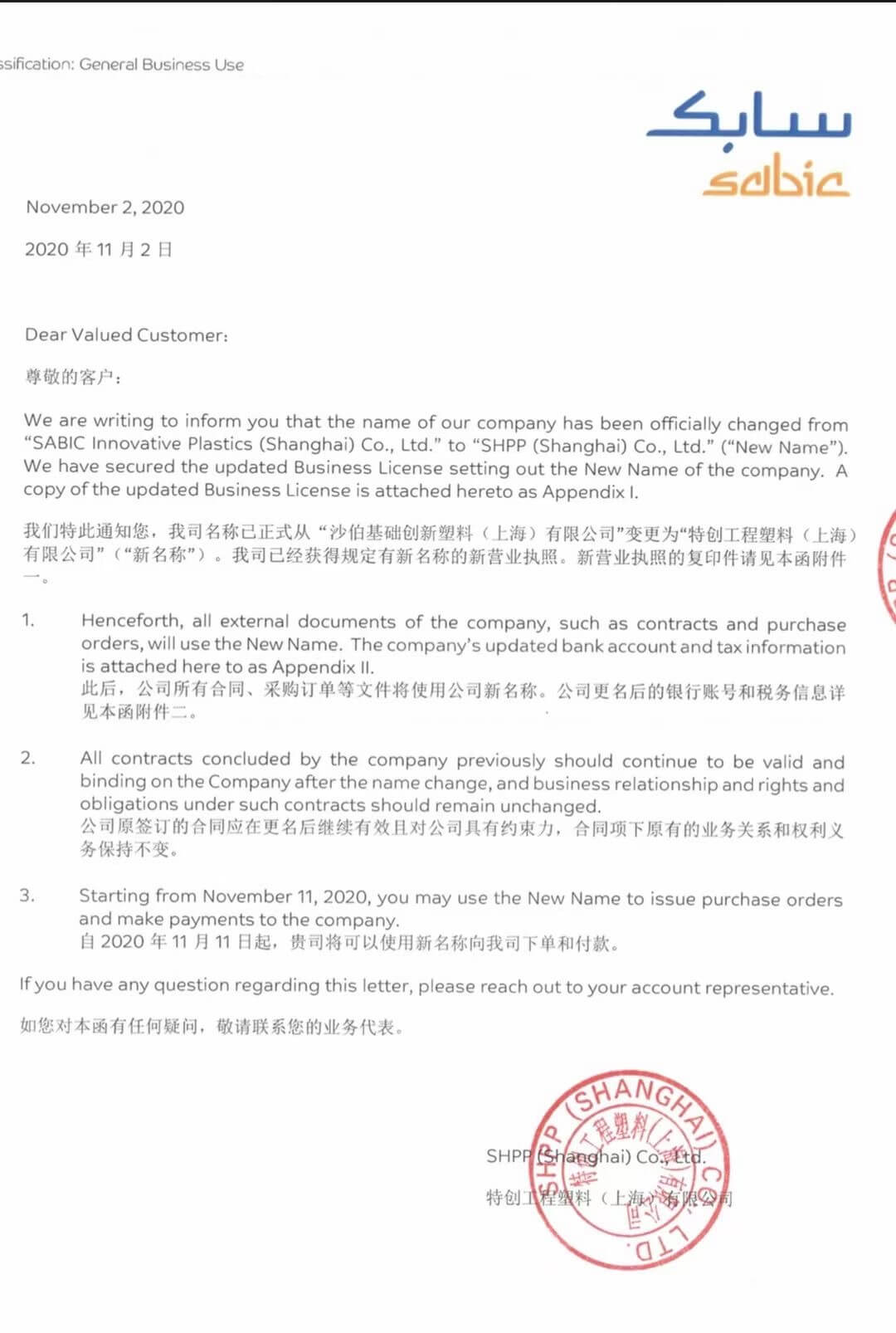 特創(chuàng)工程塑料(上海)有限公司” 英文名稱 SHPP(Shanghai) Co., Ltd 。