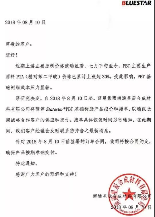 南通星辰關于暫停PBT樹脂報價接單的通知