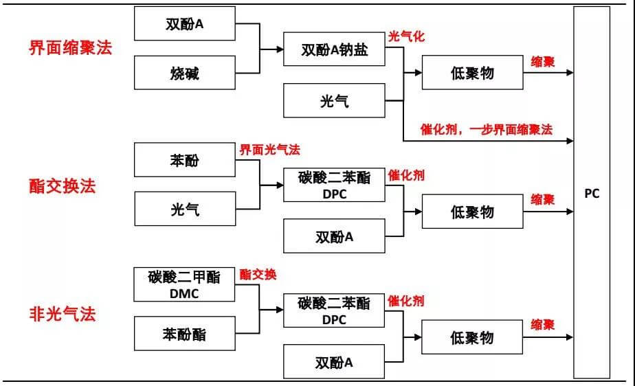 PC塑膠原料根據合成過程中是否用光氣做原料將其合成工藝分為兩大類,一類是光氣法,即使用光氣作為生產原料,主要的技術路線有界面縮聚法與酯交換法。