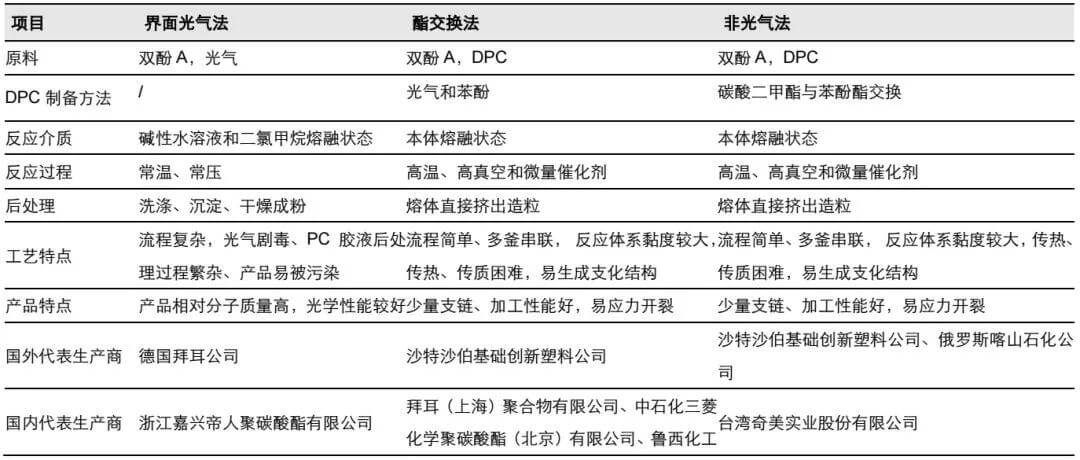 另一種是非光氣法,在此類生產工藝中,不會應用光氣作為原料。光氣法雖然是傳統的PC生產技術,但是由于該技術路線投資大,且光氣又為劇毒產品,危險性極大,世界各國對光氣的生產與應用都有著嚴格的法律規定和限制。非光氣法綠色環保,有望成為 PC 未來主要發展方向。詳見圖1和表1。