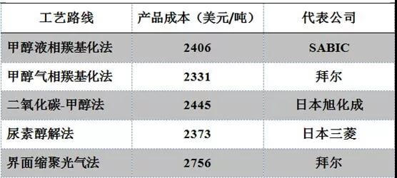 從成本方面來看,非光氣法最低單噸PC塑膠原料成本較光氣法低425美元(約3000元人民幣)左右,成本優勢較為明顯,因此非光氣法有望中長期受益。