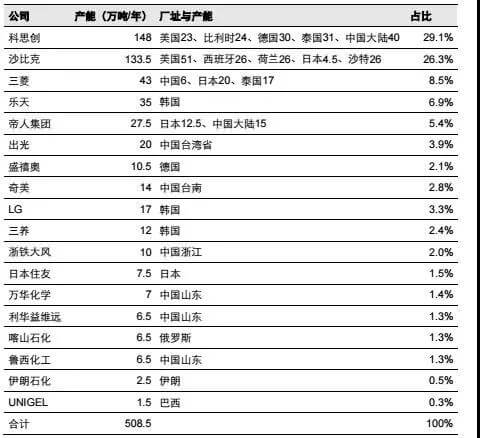 全球呈寡頭壟斷格局,國內仍處產能擴張期。1898 年,Einhorn 采用對苯二酚和間苯二酚在吡啶溶液中進行光氣化反應,首次合成出PC。1958 年,德國拜耳公司率先實現了工業化生產 PC,后續工藝經多次發展。截至目前,全球 PC 產能約為 508.5 萬噸/年,前六大生產企業產能占比約 80%左右,呈寡頭壟斷格局。未來,全球產能增長集中在我國,約有 300 多萬噸/年產能陸續建設中,海外僅有韓國樂天10萬噸/年產能投放。