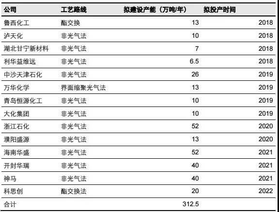 全球PC中短期將維持緊平衡狀態。2017年全球PC真實產能約為510萬噸/年,表現消費量約430萬噸,開工率接近85%左右。PC裝置投產延誤時間較長,平均有 2-3 年的延遲期。其主要源于:(1)PC 裝置很多部件沒有標準件,需要自行設計,延長了建設時間。(2)復雜的化學反應加工使得產能爬坡時間較長。(3)較長的投資周期增加了項目取消的可能性。因此,預計未來兩年,全球 PC 依舊維持緊平衡狀態,到2022年平均開工率將達到75%~80%。