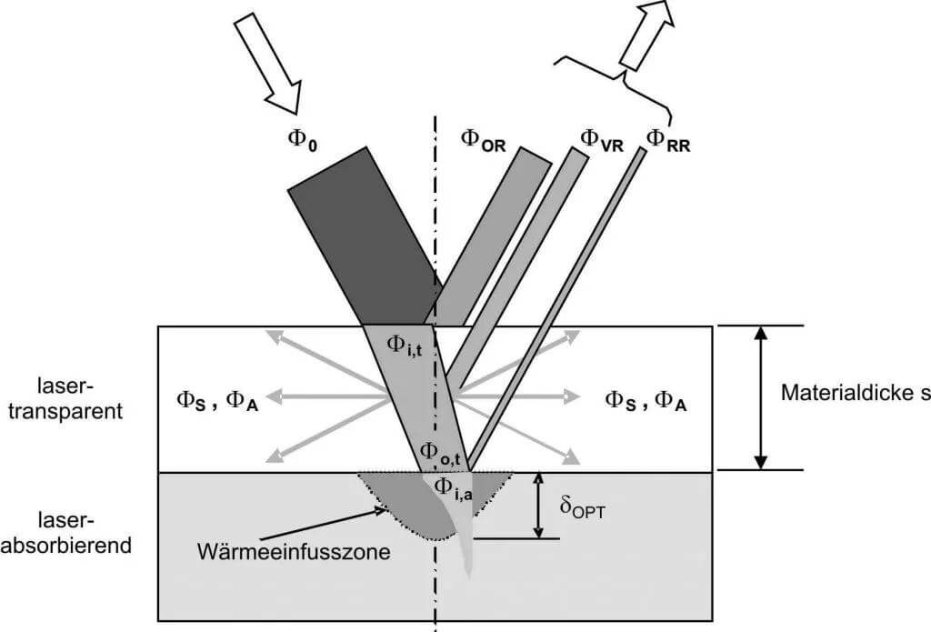 在塑料激光焊接過程中,激光打到上層穿透層塑料表面時,一部分激光會反射掉,另一部分激光會折射進入到塑料材料的內部;進入到塑料材料內部的激光,一部分會穿透塑料材料抵達激光吸收層,而另一部分激光則在塑料材料內部發生復雜的光路變化:有一些會被半晶顆粒漫反射、有一些被材料吸收、另一些經過各種反射又會回到空氣中或者進入到吸收層材料。在實際的生產中,激光一般都是垂直入射上層塑料,因此我們可以將上述簡略分為:一部分激光被反射(R),一部分激光被吸收(A),一部分激光穿透上層塑料抵達吸收層(T)。上述T+A+R=1。