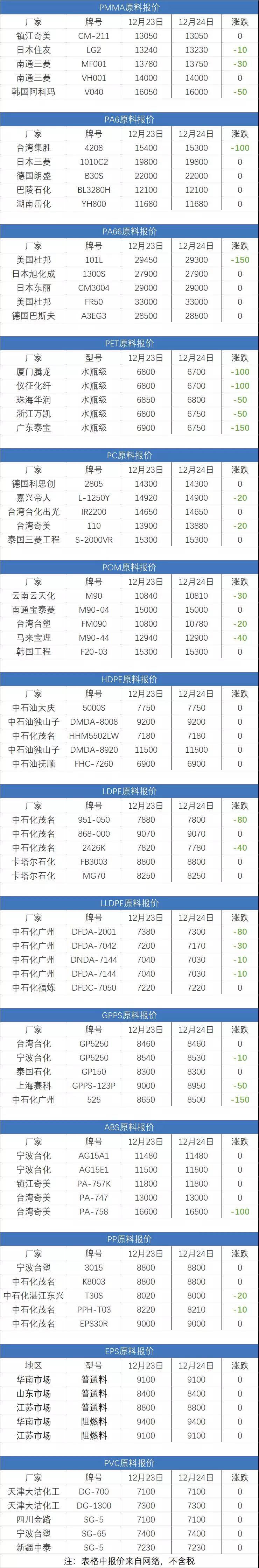 2019年12月24日塑膠原料實時報價