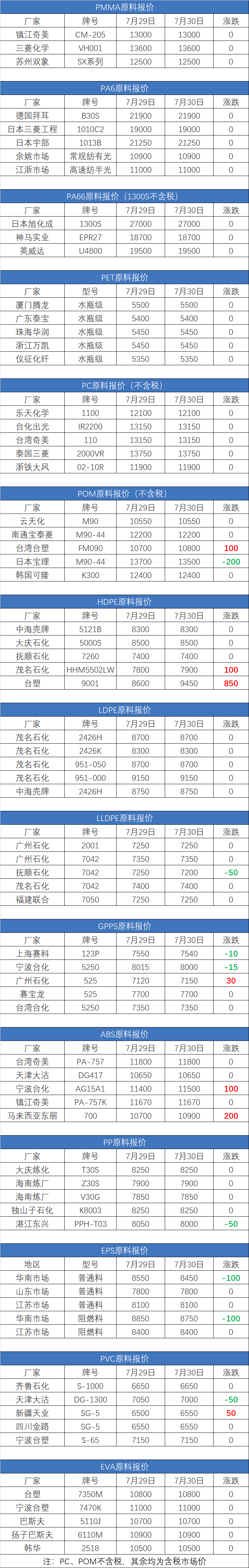 PC塑膠原料:昨日國內淡穩行情延續,交投氣氛安靜,月底階段,PC原料、供需及進口成本面均無明顯導向性消息,場內交投氣氛淡穩溫和,預計今日國內PC市場穩定整理格局仍將延續,華南地區科思創2805主流價格參考在13150元/噸。(未含稅)