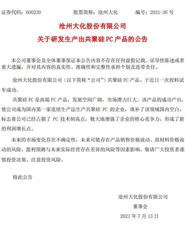 滄州大化:研發(fā)生產(chǎn)出共聚硅PC產(chǎn)品